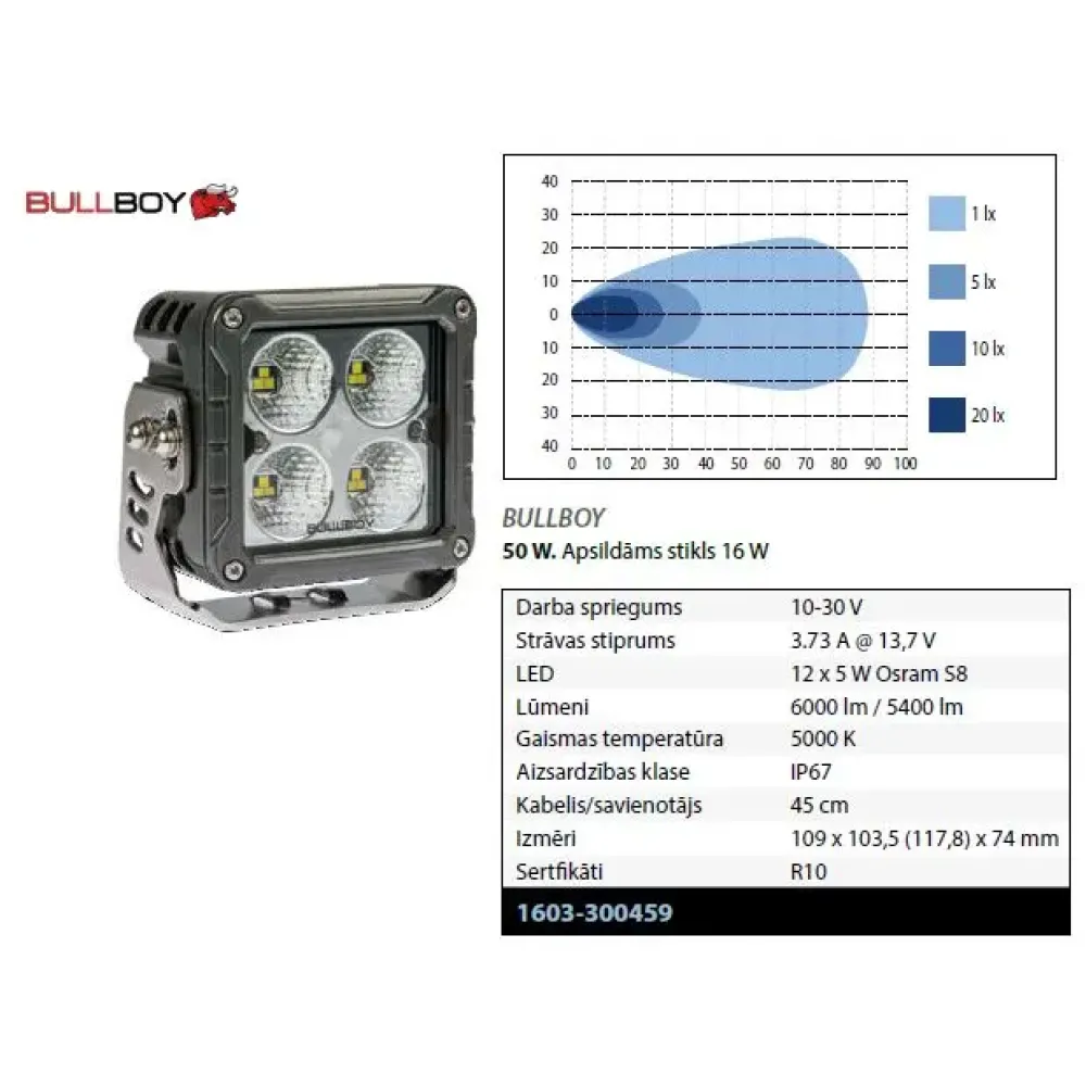10-30V, 50W, 4045-4680lm effective, wide beam, IP67, 5000K, heated lens. cable 45cm+15cm, 3-pin DT